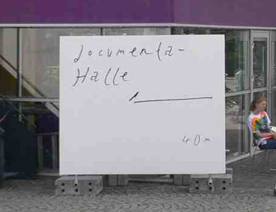 כתב ידו הנונשלנטי של האוצר. כל הצילומים: יוחאי אברהמי כתב ידו הנונשלנטי של בורגל ניכר בכל מקום, פשוטו כמשמעו: בשלטי ההכוונה לאתרים השונים, בלוגו, בשלטים על השירותים ועוד. אפילו הלוגו של הדוקומנטה עוצב כך, כפי שניתן לראות בתמונה שצולמה בכניסה לדוקומנטה האלה. מול הדוקומנטה-האלה שוכן מוזיאון פרידריכציאנום, הוותיק והגדול שבחללי התצוגה של הדוקומנטה; באותו אזור נמצא גם בית הקפה שבו אכלנו נאצ'וס עם גבינה מותכת וסלסה ושתינו בירה. מקום נחמד עם נוף מקסים, אבל אפשר לחכות בו בין שעה וחצי לשעתיים כדי לאכול פסטה או המבורגר (אנחנו, שסבלנו מרעב כבד, מצאנו את עצמנו אוכלים שאריות של שולחן סמוך עד שהגיעו המנות שלנו). בכיכר פרידריך, בין הפרידריכציאנום לדוקומנטה-האלה, חילקו גלידות וניל שקידמו מכירת ספר על גלידות בהוצאת פיידון. האמניםהאמן האהוב עלינו בתערוכה הוא בלי ספק אנטולי אוסמולובסקי (Osmolovsky). עבודתו פוליטית וחתרנית, אך גם חומרית, חושנית, מצחיקה ומשוחררת. החופש שהוא נוטל לעצמו לנוע בין המדיומים – להכיל פוליטיקה, פורמליזם, עבודת יד ועיצוב – מאפיין גם את הקו האוצרותי של הדוקומנטה בכללותה.