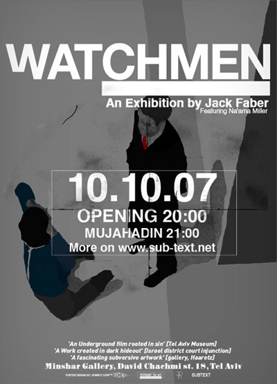 In early 2005, Jack Faber, a Tel Aviv-based artist, and his colleagues, hacked into the Tel Aviv Museum’s security camera system and recorded a masked character interacting with the artworks in the museum. The piece, entitled “Watchmen,” seeks to question the role of museums as intermediaries between the individual and his experience of art.