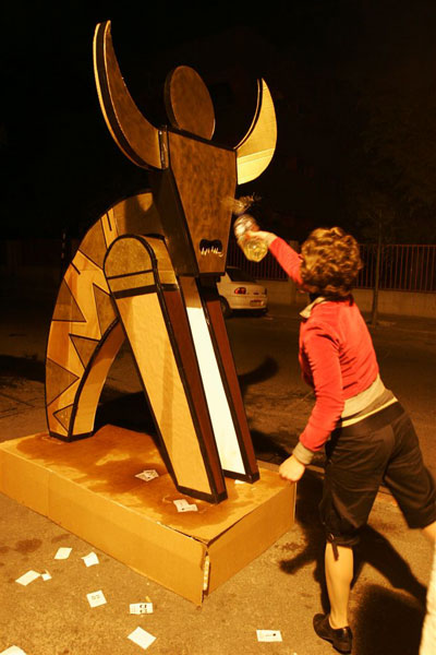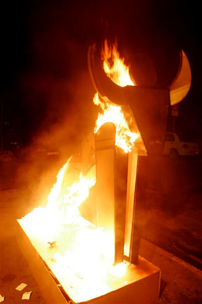 אנרכיסטית אלמונית מציתה, בלי בושה ובלי שום כבוד לאמנות, את הפסל של האמנית אלונה רודה. המציתים עדיין מסתובבים חופשי.