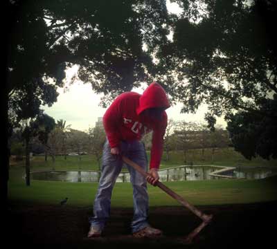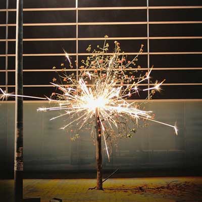 בתצלום אחר מופיע עץ קטן הניצב במעין מרפסת ובוער כזיקוק. טעון ורומנטי כסנה בוער, רגשי כמחוות אוהבים חגיגית או מסוכן כחומר נפץ, מתמצת התצלום הזה את תחום עיסוקה של התערוכה. הזיקוק משמש כמראה מקום שפועל בדיוק על הגבול החמקמק שבין האישי לתרבותי, בין הייחודי למשותף ובין הדמיוני לממשי. כזיקוק יום-הולדת, הוא יכול לעורר את מאגר הזיכרונות הפרטי: ילדות, משפחה, התבגרות, ובכל זאת הוא סימן מוסכם שמצביע על טקס תרבותי כללי ולא אישי. בתמונה אחרת מתואר באור רך "עובד אדמה" שפניו מוסתרות והוא לבוש בג'ינס וטרנינג ממותג. הקשר האסוציאטיבי בינו לבין הדימוי התרבותי של החיים הכפריים הפשוטים – שנחקק בין השאר בזכות מסורת של זורעים, מלקטים ועמלים בתולדות האמנות ובתולדות הדימויים הציוניים – עשוי לעורר כמיהה נוסטלגית לקשר ישיר עם הטבע גם בקרב מי שרגיל לנשום בעיקר עשן אוטובוסים. באותה מידה בה הבחור הכפוף יכול להיות דמות בדיונית, הוא יכול להיות גם פועל זר או עובד עירייה המטפל בדשא מודבק של פארק עירוני בנוי בדרום תל אביב. מי שרוצה להרחיק לכת יכול למצוא שם גם לא מעט דמיון לייצוגי מוות, בעיקר בשל האפלה המטפסת מקצוות התצלום אל מרכזו, כלי העבודה של העובד והקפוצ'ון שמסתיר את פניו.