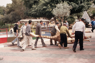 Zoo Story, 2007. Peter Friedl. Transport of giraffe in Qalqiliya, Palestine The wiry middle aged man with small blue eyes is the artistic father of Brownie, the piece of art which caused the biggest furore in Documenta. Without any explanation, the Giraffe stood in the central hall and the audience had to find out about the stuffed animal themselves. Having died in 2002 during an attack by the Israeli army, it belongs to the Palestinian Zoo in Qalqilla. This image’s interdiction Friedl imposes upon himself with hopes to undermine Western terms of art. Seemingly, Esches understanding of ambiguity plays with art as space that doesn’t narrate. Friedls refusal to use formats might play right into that. But simultaneously the artist points towards narratives even within the neutral realm of this ambiguity.- definitely a process after the beginning discussion and Anastas’ objection.