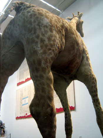 The more the knowledgeable visitor is familiar with the story the giraffe, the more it becomes powerful and touching. The story is great and the act of bringing the giraffe to the show is brilliant. If the story of the journey, the documents of request, the permits, the descriptions of the giraffe going through the check points were also presented, it would have given the work a whole new layer of meaning. But Friedl was not interested in showing us the whole amazing story of how the giraffe came to Kassel. He is interested in the "miraculous metamorphosis of (turning) the dead giraffe into an idea".