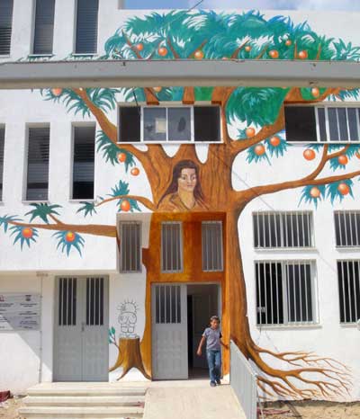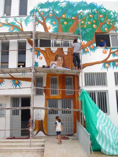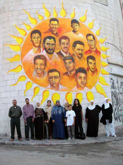 ציור קיר באזור רמאללה. ד"ר סוזן גרין, הציירת היוזמת, לבושה שחור באמצע התמונה
